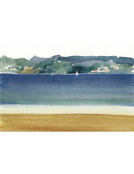 Visión abstracta del mar azul y la arena en primer plano , reproducción de Nacha Cassinello.