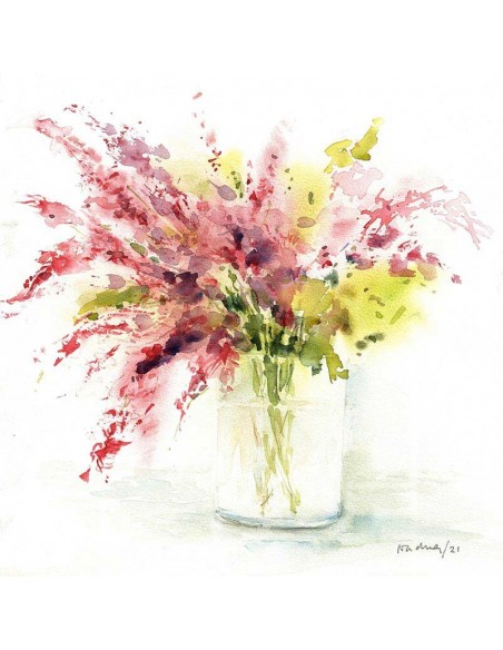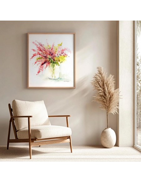 Reproducción de la obra original de Nacha Cassinello. Una delicada composición floral realizada en acuarela que captura la esencia de un ramo silvestre en un jarrón de cristal. Con pinceladas sueltas y colores suaves como el carmín, verde oliva y toques de violeta, esta obra transmite frescura, espontaneidad y una belleza natural que ilumina cualquier ambiente. Disponible en varios tamaños y acabados.
