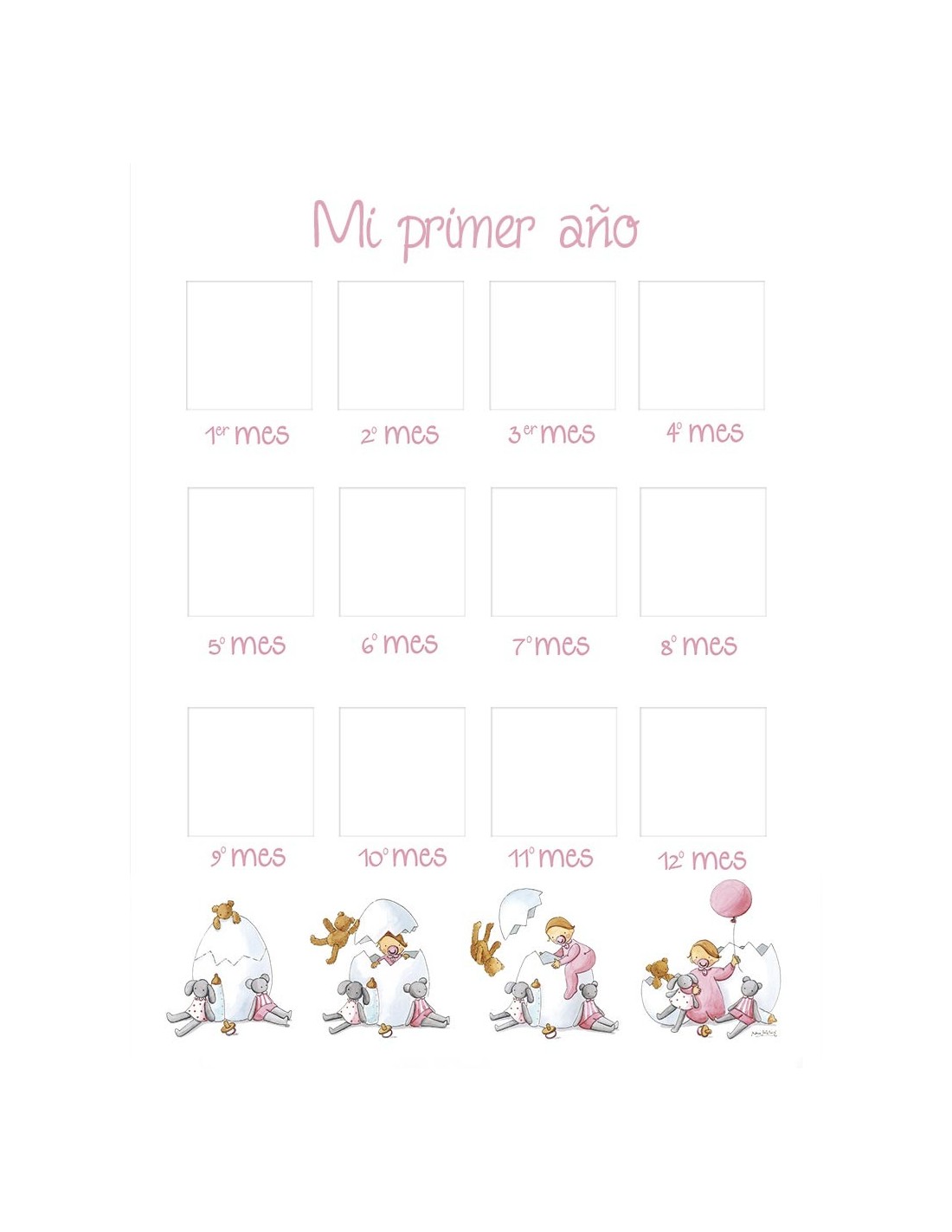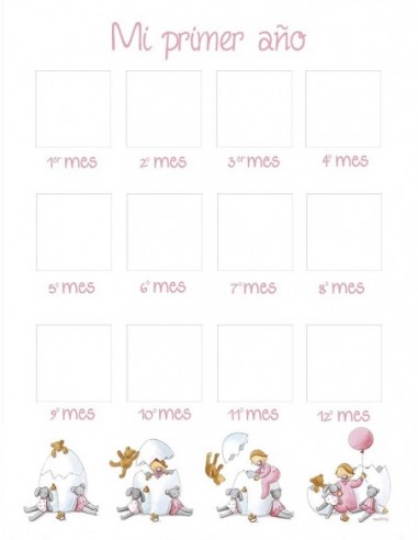 Portafoto “Mi Primer Año Niñas cascarón”, ideal para decorar su habitación. Medidas 60x40cm. Doce meses, doce fotos. Un bonito recuerdo para ver la evolución del bebé en su primer año de vida. Se puede personalizar con el nombre del bebé. El texto sin personalizar es “Mi primer año” y personalizado es "El primer año de ...". Importante: Verifique que el nombre está bien escrito y no olvide poner el acento en caso de llevarlo.