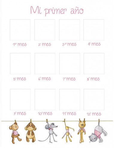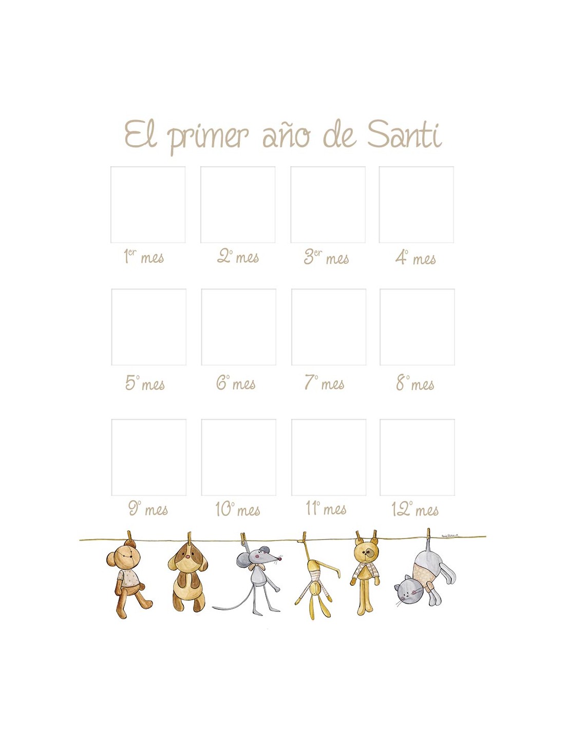 Portafoto “Mi Primer Año peluches Pinza”, ideal para decorar su habitación. Medidas 60x40cm. Doce meses, doce fotos. Un bonito recuerdo para ver la evolución del bebé en su primer año de vida. Se puede personalizar con el nombre del bebé. El texto sin personalizar es “Mi primer año” y personalizado es "El primer año de ...". Importante: Verifique que el nombre está bien escrito y no olvide poner el acento en caso de llevarlo.
